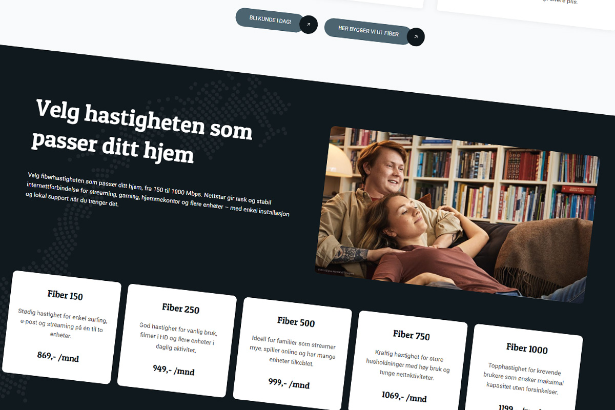 Velg fiberhastigheten som passer ditt hjem, fra 150 til 1000 Mbps. Nettstar gir rask og stabil internettforbindelse for streaming, gaming, hjemmekontor og flere enheter – med enkel installasjon og lokal support når du trenger det.